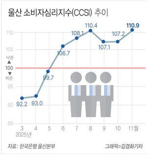 울산지역 소비자들의 경기 인식이 뚜렷하게 개선됐다. 한국은행 울산본부가 25일 발표한 '2025년 11월 소비자동향조사'에 따르면 울산의 소비자심리지수(CCSI)는 110.9로 전월(107.2) 대비 3.7포인트 상승했다. 이는 지난 2014년 1월(112.4) 이후 11년 10개월만에 최고 수치다 이번 상승에는 경기 관련 지수의 개선이 큰 영향을 미쳤다. 구성지수 가운데 향후경기전망CSI가 9포인트, 현재경기판단CSI가 8포인트 상승하며 전체 소비자심리지수를 견인했다. 생활형편전망(3), 가계수입전망(2), 소비지출전망(1)도 동